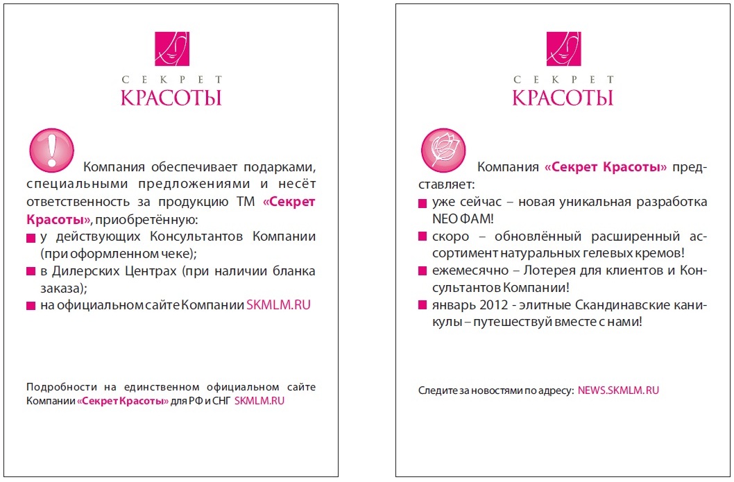 В упаковки абсолютно всех продуктов Торговой марки «Секрет Красоты», выпущенных с Периода Октябрь 2011 года, будут помещаться небольшие фирменные листовки-вкладыши: