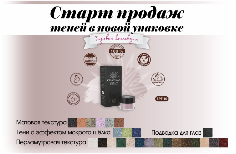 Дорогие Клиенты, Партнеры и Консультанты, рады Вам сообщить, что базовые оттенки теней «Кристалл Dекор» и подводка для глаз теперь доступны к заказу в новой, стильной дизайнерской упаковке!