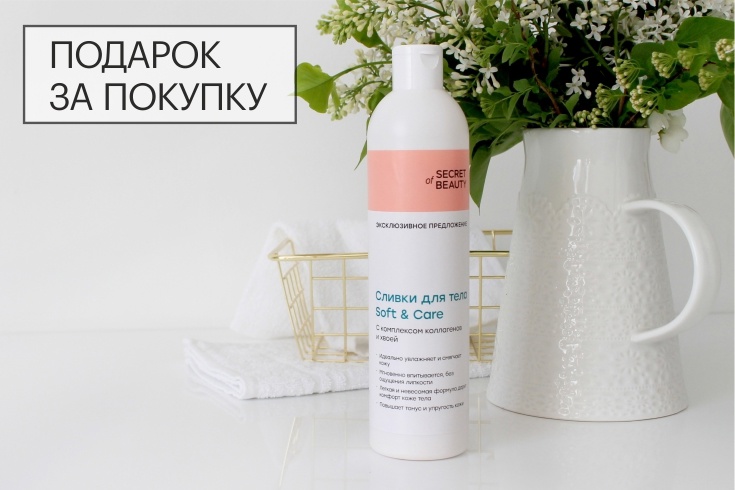 Только в мае сливки для тела Soft & Care можно получить в подарок по акции «Подарок за покупку» при единовременном заказе у Консультантов или на сайте продукции Secret of Beauty на сумму от 20 000 руб.